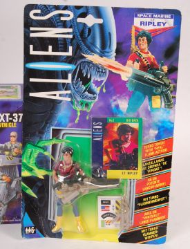 A collection of 3x 1990's Kenner made ' Aliens ' carded action figures and playset. Comprising: Space Marine Lt. Ripley, Mantis Alien (both factory sealed, unused) and ' Stinger XT-37 Vehicle playset - within it's original box.