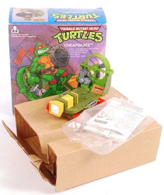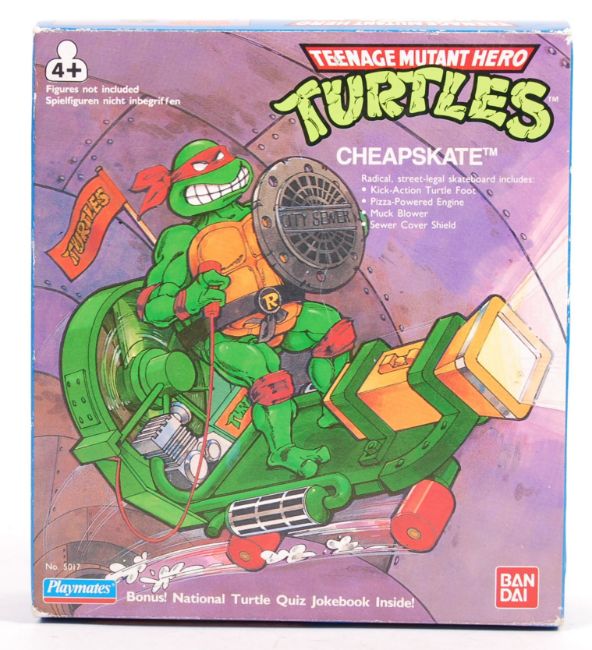 An original vintage Playmates made Teenage Mutant Hero / Ninja Turtles boxed action figure playset ' Cheapskate '. No handheld brake present, but otherwise mint. Includes the used decal sheet, Quiz Jokebook and instructions. The box still retaining its card inserts. UK ' Hero ' version. Boxed.