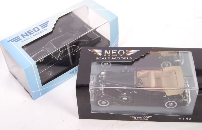 A set of 3x Neo Scale Models 1:43 scale precision diecast model cars to include; 45769 1933 Cadillac Fleetwood Allweather Phaeton, Open (Black), 46025 Pontiac GTO Hartop 1966 (Black) and 43482 Honda Prelude MK1 (Black). All appear mint in their original boxes.