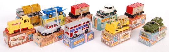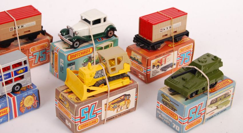 A collection of 10x assorted vintage 1970's Matchbox scale diecast model vehicles '75 Series' and 'Lesney' to include; 21 new Renault 5TL, 70 New S-P Gun, 24 new Diesel Shunter, 64 new Caterpillar Bulldozer, 2x 25 new Flat Car / Container, 73 new Model 'A' Ford, Silver Jubilee Souvenir Jubilee Bus, Matchbox 47 Tipper Container Truck and Lesney 40 Hay Trapper.