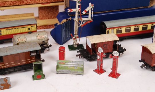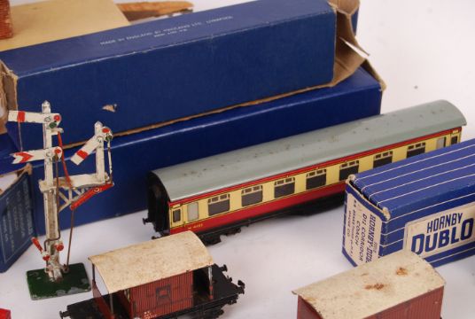 An interesting collection of vintage Hornby Dublo 00 gauge model railway trainset items - to include; several boxed coaches - D12 Corridor Coach (x2), various wagons (boxed and unboxed) a selection of Dinky Toys diecast model figures (including the RAC motorcyclist), wooden stations (with electric lights) and other sundry railway items. Good selection.