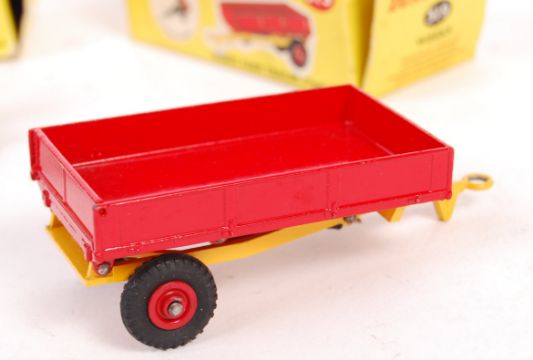An original vintage Dinky Toys made diecast model No. 300 ' Massey - Harris Tractor '. Red, complete with driver. Model in near mint condition. Within it's original box. Along with Dinky Toys No. 319 ' Weeks Farm Trailer - Tipper '. Model very near mint, also within it's original box. Boxes fair to good+. Great pair.