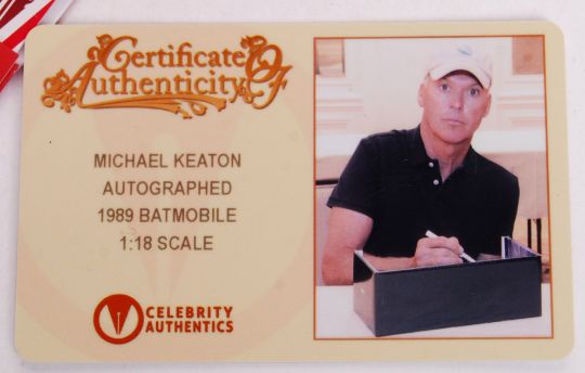 A rare Hot Wheels 1:18 scale precision boxed diecast Batman ' Batmobile ' (1992). Rare signed edition, issued by Celebrity Authentics. Autographed in silver marker to the front by Batman actor Michael Keaton. Model appears mint, and unremoved from its original base. Complete with photographic proof certificate. A rare and beautifully signed diecast Batman model.