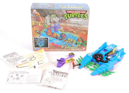 An original vintage Playmates made Teenage Mutant Hero / Ninja Turtles boxed action figure playset ' Footski'. Includes the used decal sheet, Quiz Jokebook and instructions. The box still retaining its card inserts. UK ' Hero ' version. Boxed.
