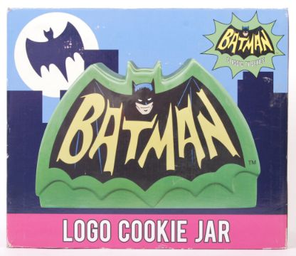 A rare Diamond Select Toys made Batman Classic TV Series ' Logo Cookie Jar '. Ceramic construction, in green with Batman logo to front. Appears mint, within it's original pictorial display box. Measures approx: 30cm