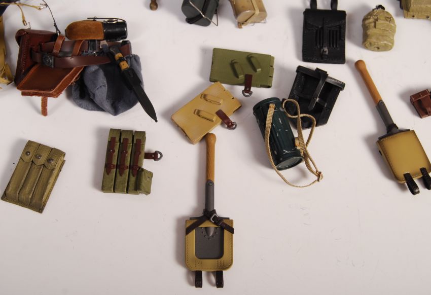 1/6 Scale Collection - a large collection of 50+ assorted 1:6 scale military soldier action figure ' kit ' items. All very well detailed, and likely by makers such as Dragon / DID Corp / Soldier Story / 3Reich / Hot Toys etc. Some possibly custom. Includes; binoculars, gas mask canisters, ammo pouches, webbing, bayonets, holsters, water bottles, canteens, entrenching tools, belts, leathers, goggles, gaiters, and many other items. Incredible collection. Note: from an impressive large 1/6 scale military action figure collection including DiD Corp, Dragon, Hot Toys, 3Reich, and others. Whilst several figures are mint and unused, the majority of the collection comes from items that have been on display. Whilst condition of all these items is generally mint, some may show signs of display use. East Bristol Auctions does not guarantee the contents or completeness of any boxed or loose figure, and buyers are reminded to satisfy themselves as to condition / completeness prior to bidding on any lot, irrespective of description.