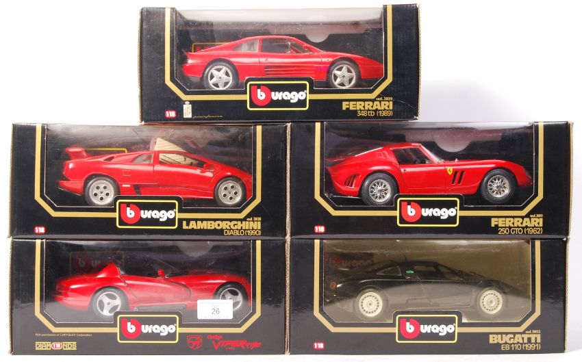A collection of 5x Bburago / Burago 1:18 scale precision boxed diecast model cars. To include; Dodge Viper, Lamborghini, Ferrari, Bugatti etc. All appear mint, unused and within the original display boxes.