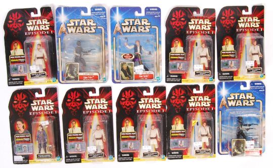 A collection of 10x assorted Hasbro made Star Wars carded action figures. Both Episode I and others present. To include; Djas Puhr, Obi Wan Kenobi, Han Solo and others. Some duplicates. All contents appear mint and factory sealed.