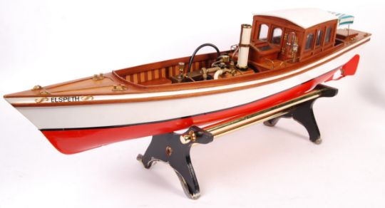 A beautifully made radio controlled live steam model of a Victorian pleasure cruiser boat ' Elspeth '. Fitted with a Cheddar Models engine and 3" boiler. Radio gear fitted and appears complete (no transmitter unit). Highly detailed model boat, including various brass details and fixtures. The cabin in particular is very highly detailed, including the interior. Gas powered live steam. Untested, but appears in very good well-maintained condition, and was in regular use by the late vendor.  Supplied with a display stand. Measurements: 105cm long, 22cm tall with a 3" boiler. A beautiful and very well made live steam model boat.