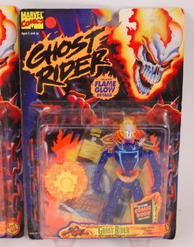 A collection of 3x vintage 1990's Toybiz / Toy Biz made  ' Ghost Rider ' carded action figures. Licensed by Marvel Comics. Comprising: The Ghost Rider, Zarathos, and Exploding Ghost Rider. All mint, factory sealed and unused.
