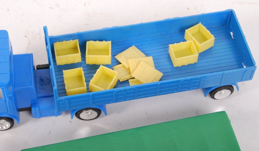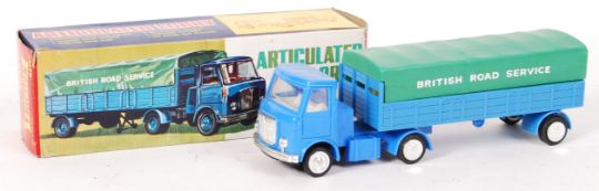 A rare vintage 1960's ' Lucky Toys ' Made In Hong Kong plastic friction powered ' Articulated Lorry '. Blue, with green removable ' British Road Services ' hood and 6x plastic crates present. Appears mint (x2 crate lids missing), within the original box. Friction motor in working order. Measures approx; 23cm long in total.