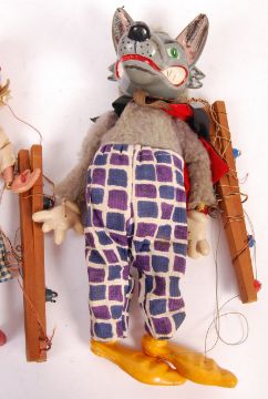A charming collection of 3x vintage Pelham Puppets - all unboxed, comprising: Wolf, Boy & Girl. All appearing in generally good condition, all with strings neatly wound together. Stamped ' Pelham ' to handles.