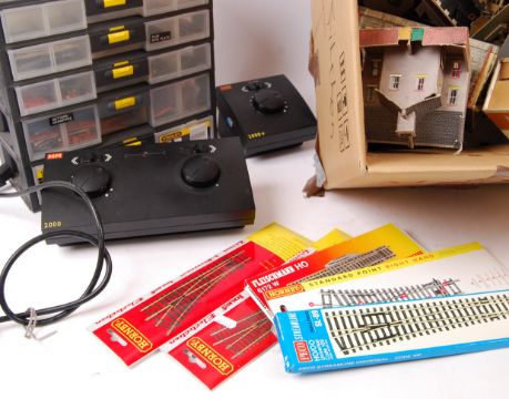 A collection of 00 Gauge model railway locomotive trainset trackside platform buildings and spare parts, 5x boxed standard point track along with Hornby modules HM2000 & HM2000+.