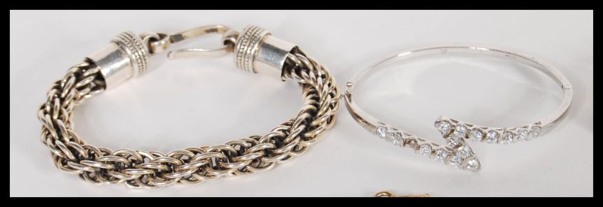 A good group of sterling silver bracelets to include a silver curb link example, large 925 twist bracelet, silver ring bracelets with heart charms x2, two silver bangles, large silver snake link bracelet, and an unusual silver bone link bracelet. Total weight 282 grams.