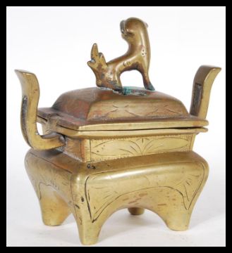 A 19th Century Chinese bronze censer ding incense burner bowl raised on four legs with Fu Dog finial lid. Measures 12cm high x 12cm width.