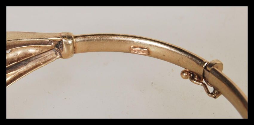 A vintage 9ct gold bangle bracelet of circular form having a flush row of black and white stones with twin spilt shoulder.s Hidden clasp and safety catch to side. Weighs 9.8 grams.