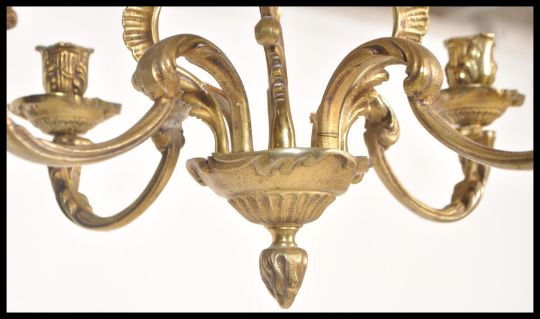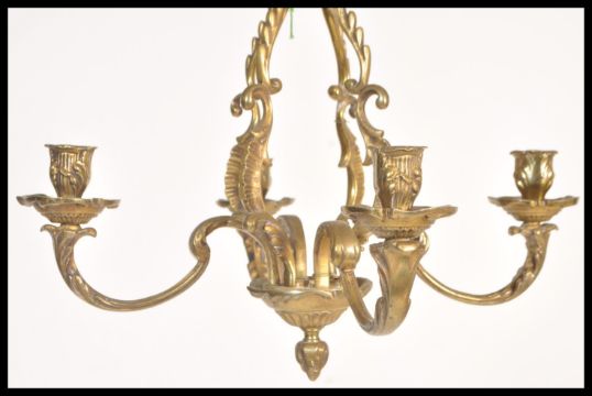 A 20th Century bronze candelabra having four candle sconces with scrolled acanthus leaf decoration, suspended from a chain. Measures 54 cm high x 37 cm diameter.