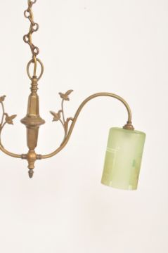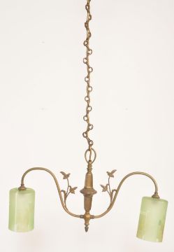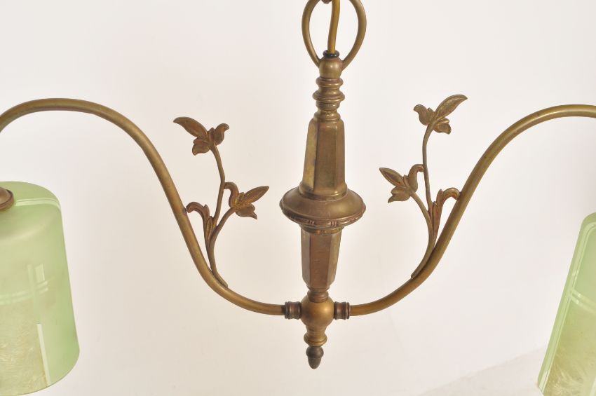 A 20th Century brass ceiling light chandelier in the manner of Adams revival having scrolled brass arms complete with two green glass frosted shades.