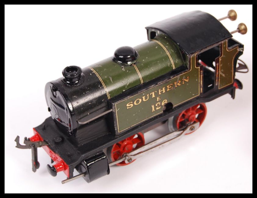 A Hornby Series 0 Gauge model railway clockwork mechanical trainset locomotive ' Southern E 126 0-4-0 Tank Loco in green livery along with 2x GWR Great Western Railway passenger carriages ( First & Guard ) and a boxed 42118 No.31 Coach First/Third.