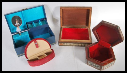 A collection of four 20th Century jewellery boxes to include an inlaid example, ostrich skin example etc. Biggest measures 9cm high by 23cm wide.