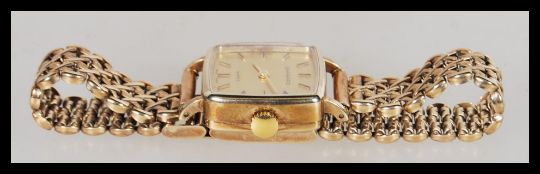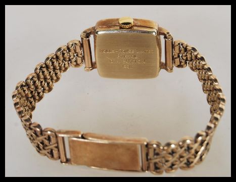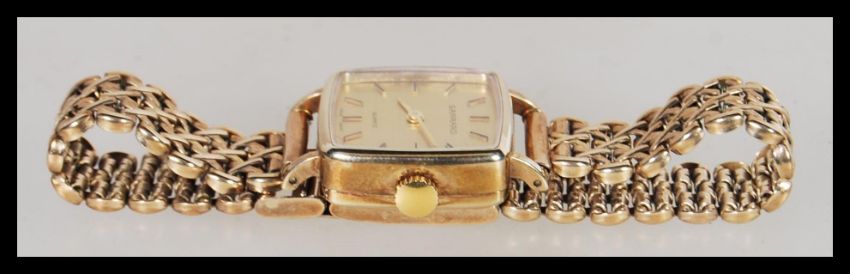 A vintage Garrard 9ct gold ladies watch set to a 9ct gold cross mesh link watch bracelet strap. The champagne dial having gilt baton numerals and faceted hands. Quartz movement. Complete in watch box with spare links and leather strap. Weighs 23.8 rams gros.