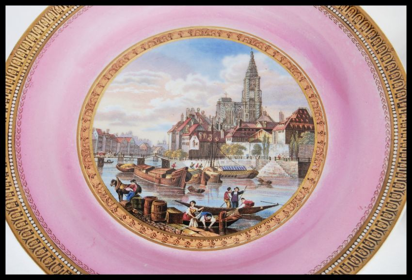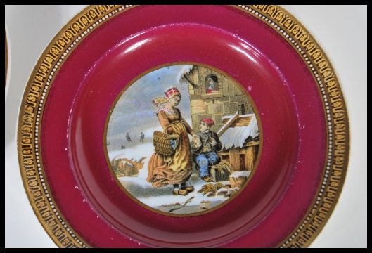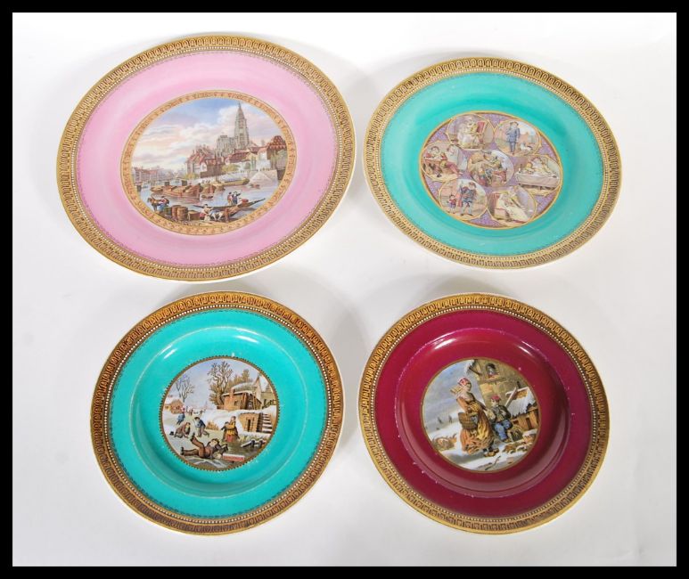 A group of four 19th Century Victorian F&R Pratt & Co Fenton prattware ceramic plates decorated in powder colours with gilt borders. Central panels depicting scenes to include Dangerous, Seven Ages Of Man etc. Largest measures 21cm diameter.