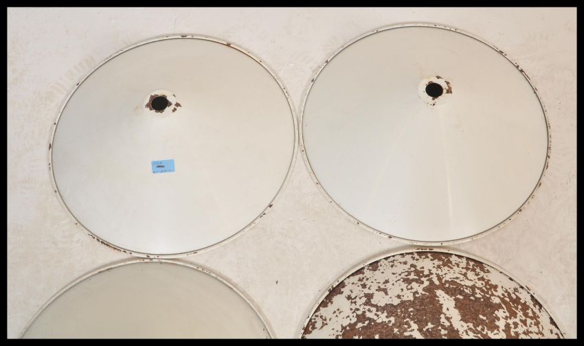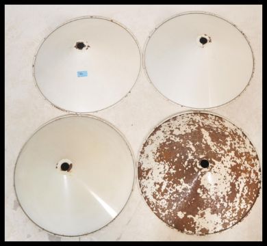A set of four vintage retro 20th Century industrial factory pendant light shades of UFO form having a white enamel finish. Measures 45 cm diameter.