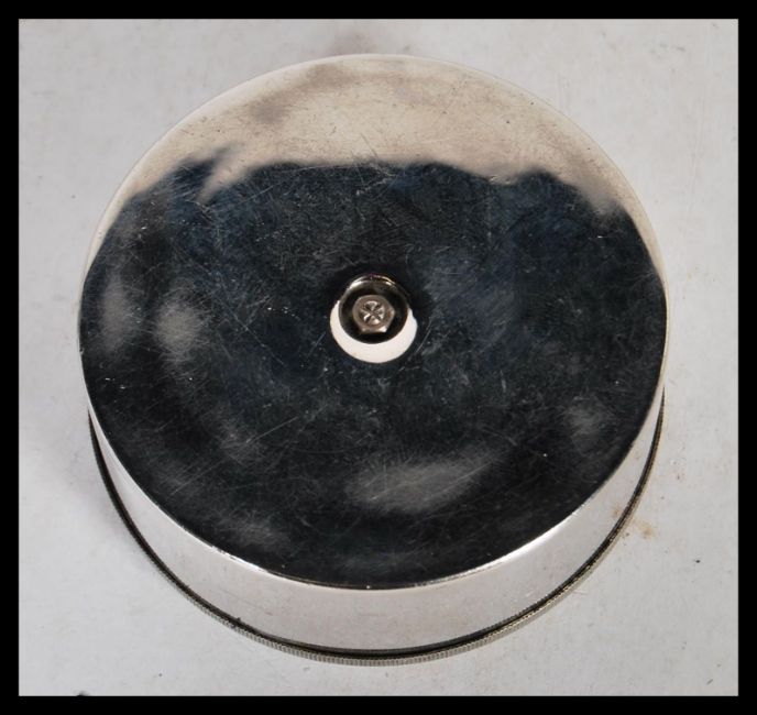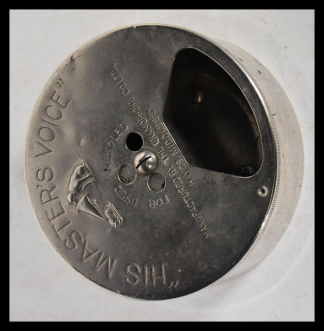 A vintage early 20th Century His Masters Voice HMV chrome plated sectional needle case, the canister with impressed His Master's Voice to the top, HMV logo of Nipper in relief, three central holes to the centre for used needles. Manufactured by the Gramophone Co Ltd, Haynes Middlesex.