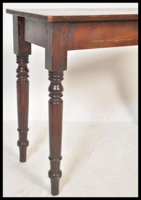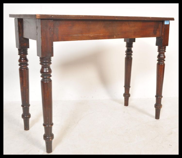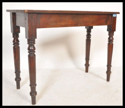 A Victorian 19th century mahogany writing table desk being raised on turned legs with fitted frieze frame having a flared edge top above together with a 19th Century mahogany desk chair.