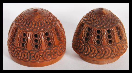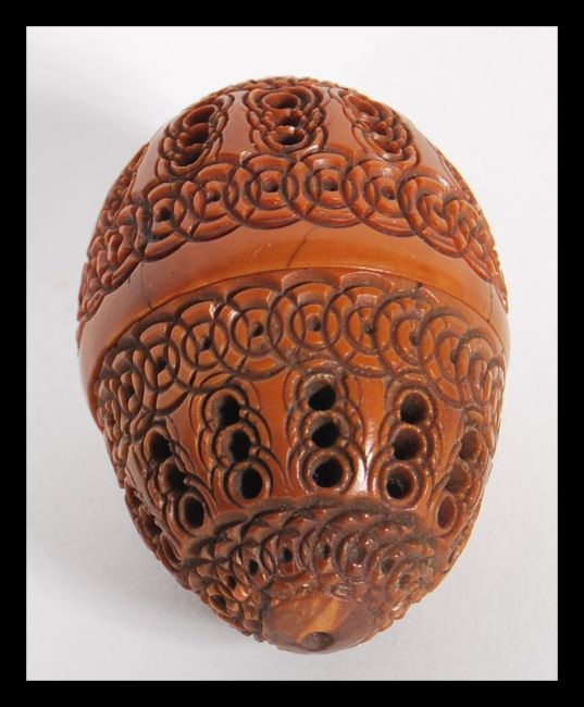 A 19th Century treen carved coquilla nut, the nut carved for use as a nutmeg grinder holder, the carved nut decorated pierced decoration. Measures 5cm long.