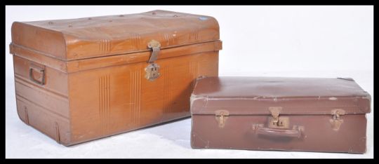 A 20th Century vintage industrial japanned steel trunk having a painted brown finish, along with a brown leatherette travelling trunk / suit case.