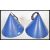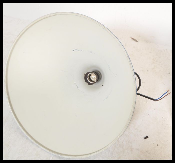 A pair of vintage retro 20th Century industrial factory pendant shades on conical cone shape having a blue enamel finish. Measures 25cm high x 35cm diameter.