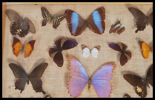 Entomology - A collection of taxidermy butterfly specimens pinned to a hessian background, mostly of tropical origin, set within a gilt framed display case. 23 butterflies in total, along with a large boxed butterfly with brown and green iridescent wings.