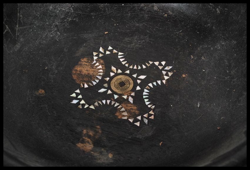 A collection of items to include a Chinese wooden bowl with inset monetary token inset into the base flanked by mother of pearl decoration, a Japanese lacquered brush bot decorated carp in relief to base, a framed bronze Chinese token etc.  31cm high tallest.