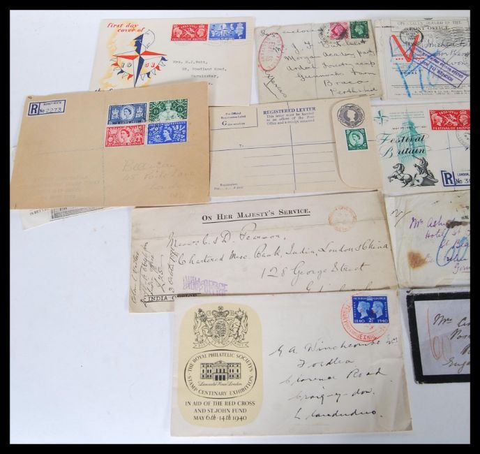 POSTAL HISTORY Shoebox with range of British stamped envelopes, postcards etc all reigns from Victoria to Elizabeth. Mostly commercial non philatelic mail. Interesting items and postmarks.
