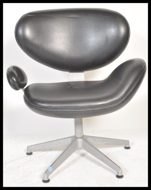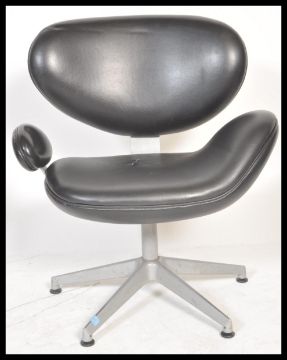 A contemporary Scandinavian 'egg ' design swivel desk chair having a shaped vinyl backrest and shaped padded seat on one armrest in black vinyl and raised on a five point star base. Measures 88 cm high x 77 cm wide x 50 cm deep.