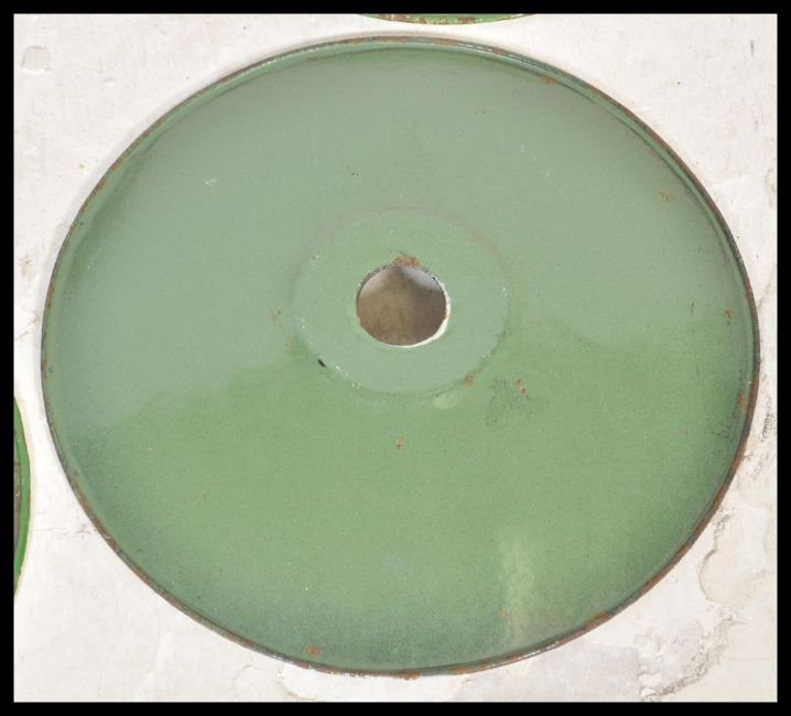 A group of four vintage retro 20th Century factory industrial pendant shades consisting of a brown enamel example and a set of three green enamel examples. Measures 28 cm diameter.