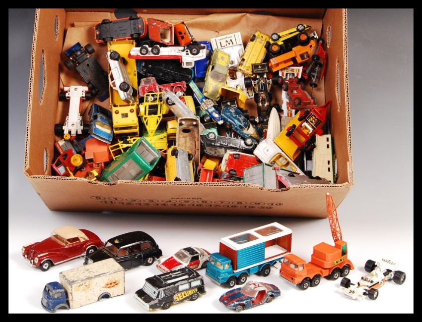 A large collection of 70+ assorted scale diecast model vehicles mostly Corgi to include; Corgi Mercedes-Benz C111, Corgi Ford Consul Cortina, Corgi Austin London Taxi, Lesney No.M-6 Racing Car Transporter, Dinky AA Services Bedford Van and much more.