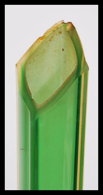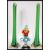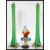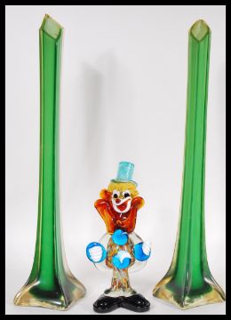 A pair of vintage 20th Century green studio glass tall stem vases of tapering form together with a retro studio  glass clown by Murano. Tallest measures 42cm high.