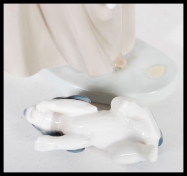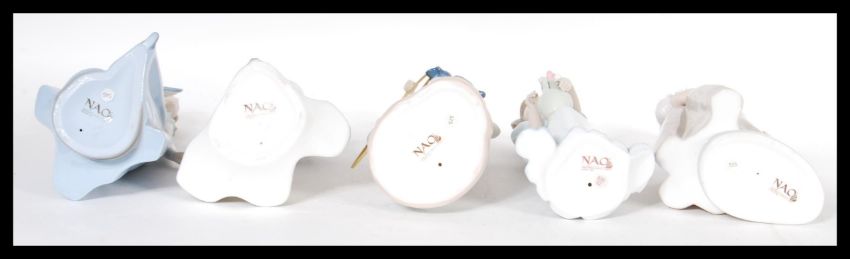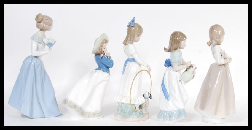 A collection of five Nao porcelain figurines to include a girl with a jug full of flowers no. 01001, a lady with a fan 00402, a girl with a sparrow on her shoulder no.01134, a girl with a puppy and a hula hoop no. 00379 and a girl holding a bouquet no. 01004. Tallest measures 24cm high. Tallest measures 24cm high.