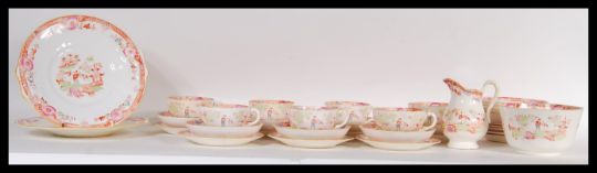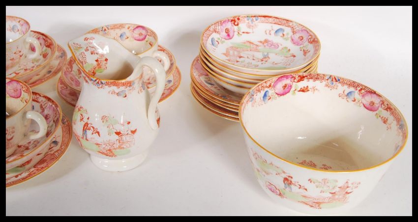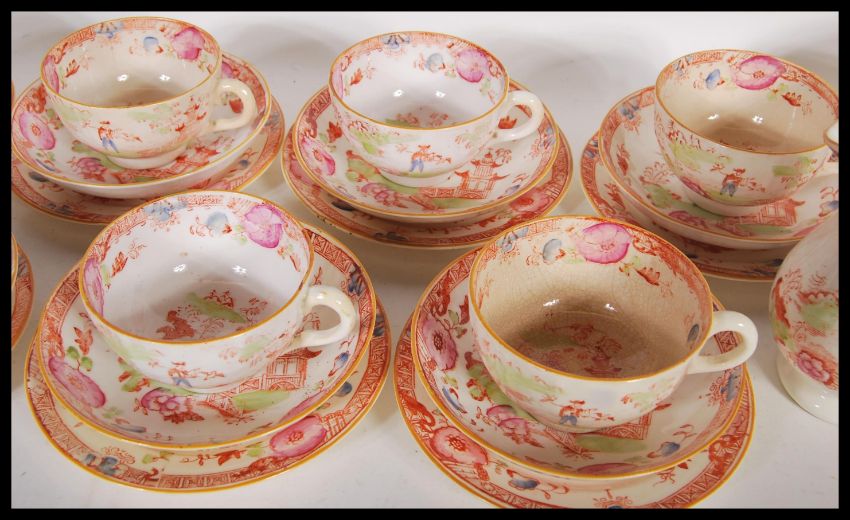 A Victorian 19th Century English Staffordshire tea set consisting of tea cups, saucers, side plates, sandwich/ cake plates, sugar bowl and creamer. Depicting oriental scene with geometric borders and floral sprays throughout.   Measures 24cm diameter (sandwich plate)