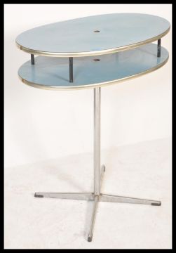 A vintage retro 20th Century 1960's two tier table of circular form having blue formica tops raised on chrome X base. Measures 84 cm high x 71 cm wide x 46 cm deep.