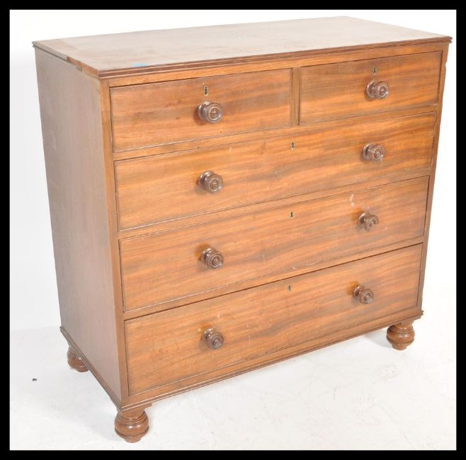 A Victorian 19th century flame mahogany 2 over 3 two tone chest of drawers being raised on bun feet with  2 short over 3 deep drawers with knob handles. Measures 104cm high x 108cm width x 49cm deep.
