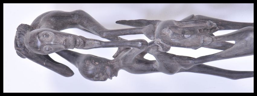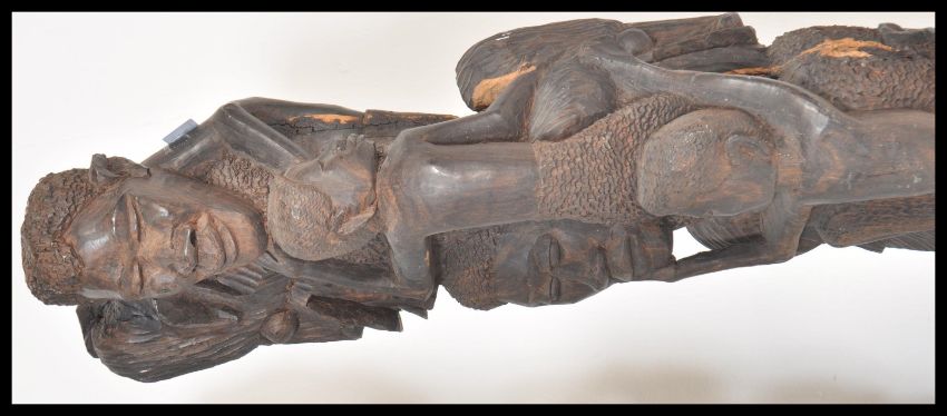 An early 20th Century African Tree Of Life ebony hand carved sculpture featuring figures being held up by the previous generations along with a similar African tribal statue.