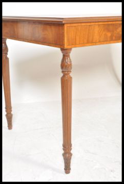 A good quality Georgian revival mahogany and crossbanded inlaid centre table. Raised on turned, tapering legs with inlaid, crossbanded frieze with rectangular table top above. Measures 77cm high x 137cm width x 76cm deep.