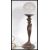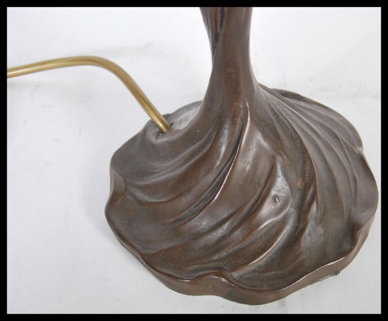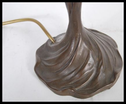 An Art Nouveau bronze effect table lamp in the form of a maiden holding a large globular opalescent shade. Measures 47 cm high.