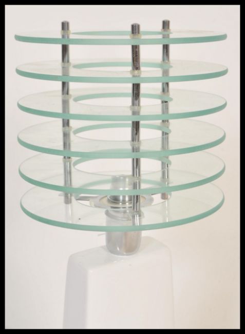 A vintage retro 20th Century table lamp having a white enamelled body with a chromed base and black and white chorded wire, with a lamp shade of round glass pieces above.