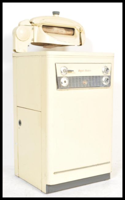 A vintage retro 1950's mid 20th Century wringer washing machine having a white enamel painted finish by English Electric. Measures 120 cm high x 62 cm wide x 62 cm deep.