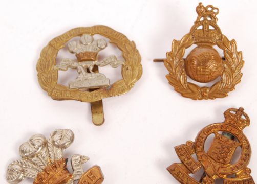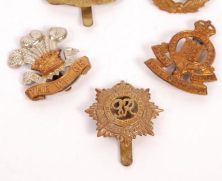 A collection of 5x WWII Second World War military uniform cap badges - to include; South Lancashire Regiment, RAOC and others. All original period pieces.