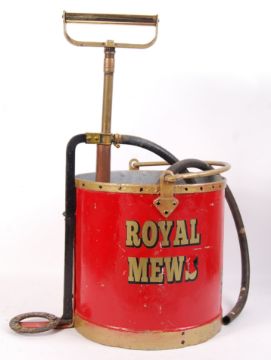 A vintage early 20th century large metal fire pump and bucket having painted notation for the ' Royal Mews ' in bold lettering. Pump to side with swing handle atop. 74cm high x 35cm in diameter.